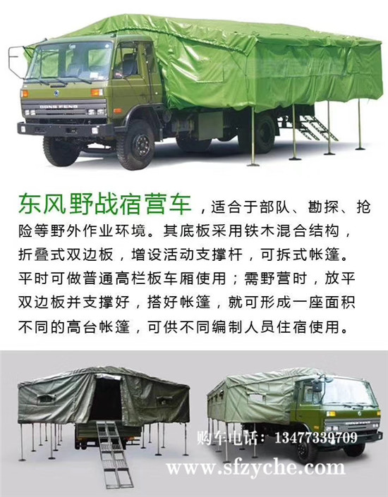 東風原廠EQ5118XZS6D15型宿營車和EQ5120GA1型天錦宿營車6.1米篷布配套直供。適用于東風EQ5118XZS6D15宿營車和EQ5120GA1天錦宿營車等東風系列車型,軍用宿營車供部隊野外住宿使用。車箱內部尺寸6100mmX2210mmX1850mm。宿營車車廂在采用折疊式雙邊板,增加滑道內設支撐桿,可拆式帳篷。平時可作為普通高欄板軍車使用;部隊需野營時,放平雙邊板并支撐好,搭好帳篷,就可以形成一座面積達38㎡的高臺帳篷,可供36人住宿用。 東風原廠宿營車篷布總成價格一套為5300元含稅。