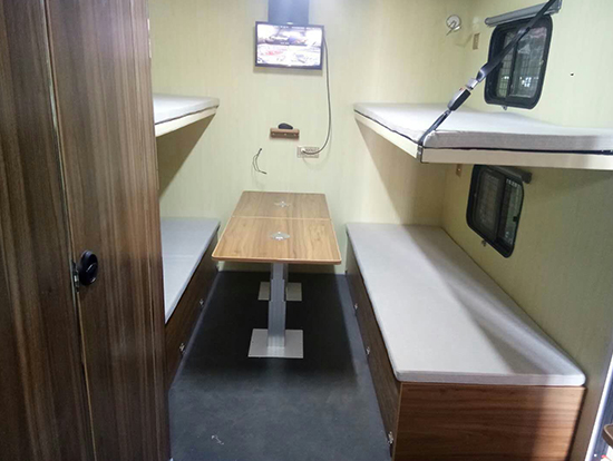東風大型四驅越野房車滿足更多路況復雜環(huán)境使用,廂體內裝有豪華折疊床、液晶電視、儲物柜、應急燈、頂燈、頂置空調、床墊、被褥、燃油加熱器、頂護欄、爬梯、隱藏抽拉梯、專用房車門、中空玻璃、戶外燈。由保溫廂體、空氣調節(jié)系統(tǒng)、宿營設施、影音系統(tǒng)、電氣系統(tǒng)、通風換氣系統(tǒng)、洗漱和衛(wèi)生設施。整個廂體分為三個部分,住宿區(qū)、洗漱區(qū)、餐飲區(qū)。住宿區(qū)包括四個上下鋪,床頭燈,液晶電視,空調等。洗浴區(qū)包括臉臺,衛(wèi)生間,熱水器等。餐飲區(qū)包括無煙灶臺,可活動餐桌,洗菜盆等。也可以根據(jù)用戶的需要設計,可增加會議室,辦公區(qū)等。東風大型四驅越野房車內飾圖片: