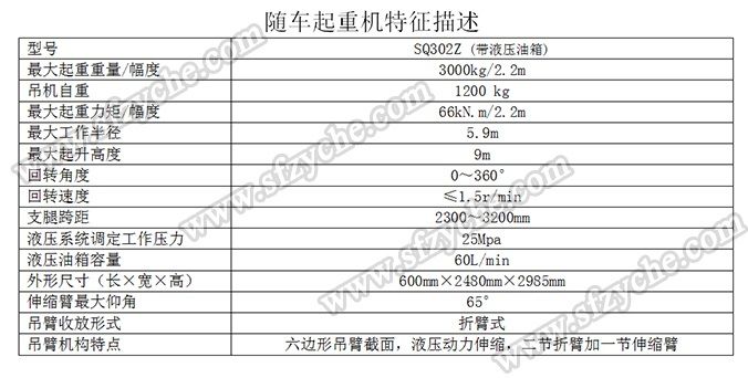 凈功率206kw; 起重機(jī)型號為:SQ302Z(帶液壓油箱),起重機(jī)質(zhì)量為:1200kg,最大額定超升載荷為:3000kg. 側(cè)防護(hù)金屬材料Q235斷面槽形,螺栓連接,斷面高度40mm,離地高度450mm; 后防護(hù)金屬材料Q235斷面槽形,螺栓連接,斷面高度135mm,離地高度500mm; 安裝具有衛(wèi)星定位功能行駛記錄儀,東風(fēng)越野隨車吊:m.shabbychicwny.com 吊機(jī)詳細(xì)參數(shù):