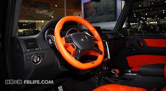 北京車展上的基于G63 AMG 6×6改裝而來的BRABUS 版700G 6 X 6 內(nèi)飾方面,該車采用了黑色和橘黃色的顏色搭配,強(qiáng)烈的顏色反差構(gòu)造出不錯(cuò)的視覺效果。四幅式真皮方向盤外圈也采用橘黃色真皮包裹,搭配顏色裝飾條,視覺效果極佳。擋把的設(shè)計(jì)類似于飛機(jī)操作感,上面印有巴博斯的標(biāo)志,非常具有設(shè)計(jì)感。