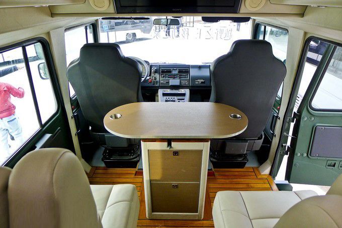 越野房車內(nèi)飾:可以看到,柚木地板外加兩個電動座椅與一個帶儲藏柜的可移動多功能桌構(gòu)成了這輛越野房車的第二排。除此之外,頭頂上方安置有26寸索尼液晶電視和帶衛(wèi)星電視機頂盒的藍光播放器,微波爐烤箱、小型冰箱、電磁爐等常用設(shè)備也是一應(yīng)俱全,當然恒溫式的出水系統(tǒng)以及真空馬桶、獨立淋浴也是一樣不少。具備天窗和側(cè)窗的尾箱處安置有兩張舒適的標準床鋪,可以說盡管這輛U5000并非加長特裝版,但所有居住設(shè)備都很齊全。
