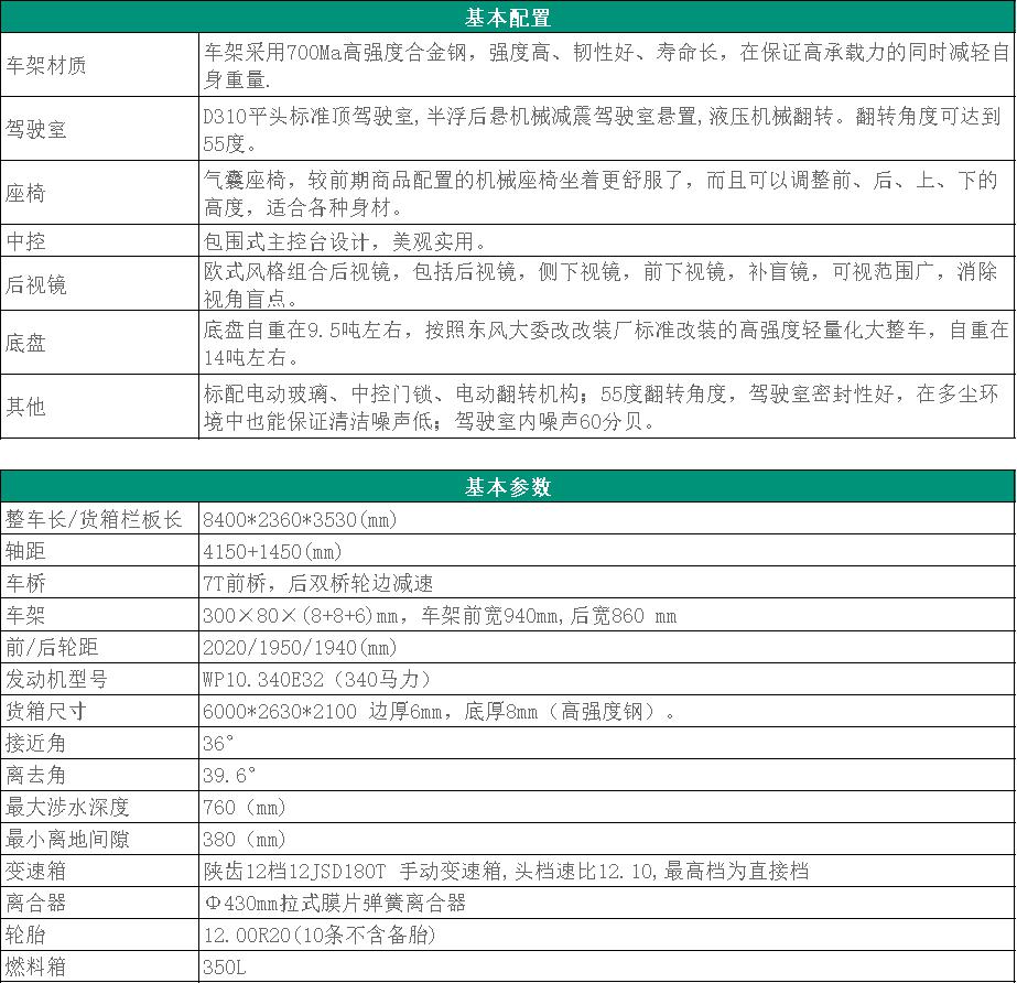 東風大力神KC六驅(qū)自卸車配置參數(shù):DFL3251KC型六驅(qū)大力神自卸車,采用天龍大力神KC駕駛室,三段式保險杠,液壓翻轉(zhuǎn),帶原廠空調(diào),濰柴國三WP12.340型340馬力發(fā)動機,法士特十二檔變速箱,軸距4500+1400mm,株齒分動箱,北奔9噸前驅(qū)動橋,選裝13/16噸輪減中后橋,輪減、差速鎖,大梁300mm自卸專用梁,輪胎12.00R20鋼絲胎10+1條,5.6米-6米自卸貨箱,車廂采用邊10底12mm鋼板,加裝淋水器。
