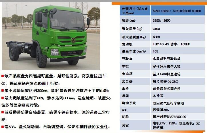 EQ2070GZ4DJ越野四驅(qū)底盤的詳細(xì)描述:該產(chǎn)品底盤為四驅(qū)越野底盤,越野性能強(qiáng),高強(qiáng)度抗扭車架,保證車輛在復(fù)雜路面上行駛時(shí),不會出現(xiàn)大梁斷裂等情況;最小離地間隙達(dá)到300mm,能輕易通過泥濘坑洼不平的山路;最大爬坡度達(dá)到了60%,適應(yīng)陡峭、坡度大、坡多等復(fù)雜路況行駛。前后橋帶防滑自鎖裝置,確保車輛在積水、泥濘道路正常行駛;帶ABS、盤式制動器、自動調(diào)整臂,保證車輛行駛的安全性。